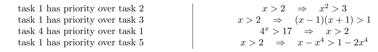 The goal here is to identify whether a syllogism can be composed[1] by prior ones. Simplifying the input format, the above correspond to identifying paths in token sequences describing the directed edges of an underlying graph, i.e., whether there is a directed path 3 → 5 (case 1) or 4 → 2 (case 2) using the directed edges {(1 → 2),(1 → 3),(4 → 1),(1 → 5)}.