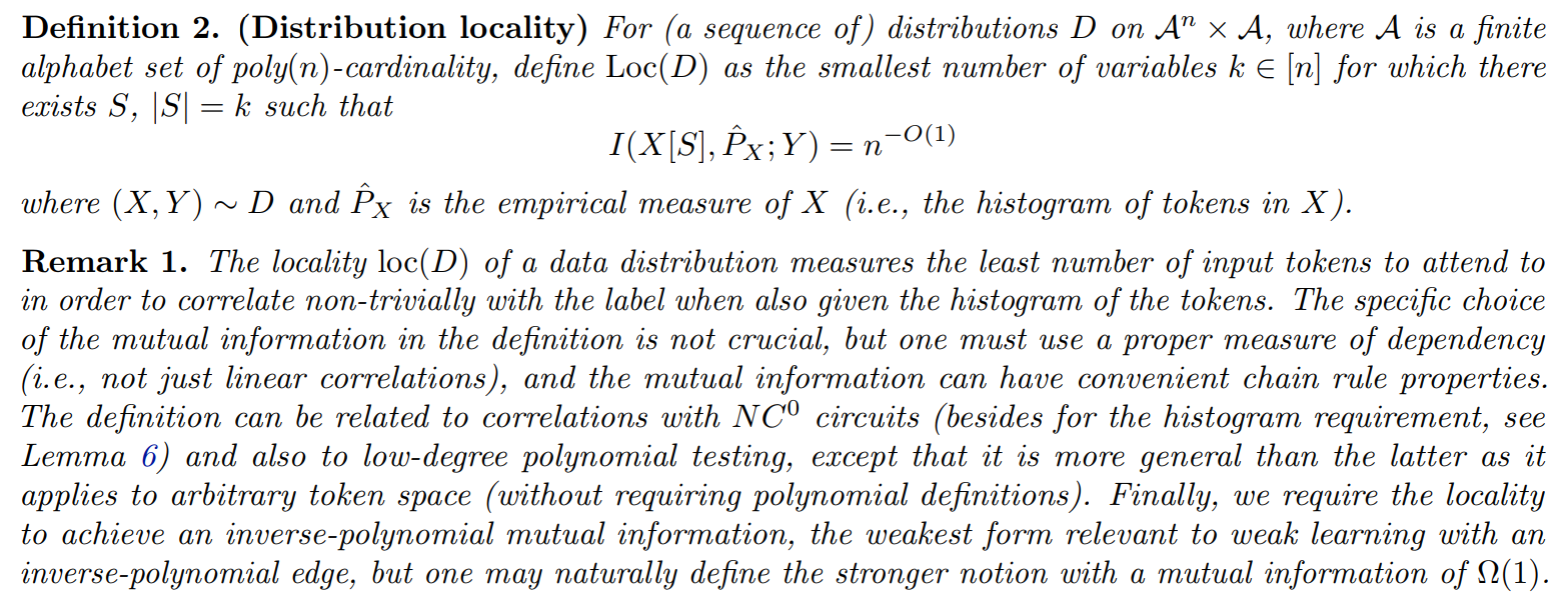Attributes of glob and some examples. The locality has the attributes that of being (i) a fairly explicit measure, (ii) applicable to any data distribution on tokens without having to infer a distribution class from the model invariances to estimate the distribution complexity, (iii) not limited to i.i.d. inputs but any input distribution, (iv) relevant to current models of interest such as Transformers.